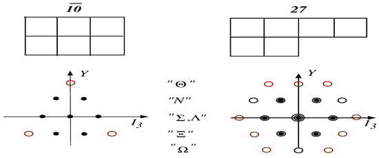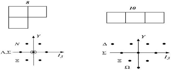 For we have and the representations with the lowest eigenvalues are the octet () and the decuplet () []. Their Young tableaux and particle content are shown in Figure 1.