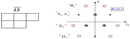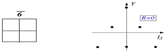 Finally, let us have a brief look at pentaquarks with a heavy antiquark. They are constructed from heavy meson bound states with negative energy eigenvalues. The resulting binding energy is significantly less than that of ordinary bound states and may even be unbound in the charm sector []. Since negative energy eigenvalues correspond to and , the lowest dimensional representation available is the anti-sextet () representing four (light) quarks as shown in Figure 7.