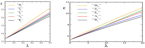 In Figure 6 we show the flavor symmetry breaking eigenvalue of these states as a function of the strength of the symmetry breaking. We actually observe that the order of the eigenvalues for and type states is reversed as the strength assumes its empirical value, . Also the eigenvalue for , the candidate for the lowest charmed exotic baryon, significantly deviates from a straight line. These findings doubt the truncation of the perturbation expansion at the first order [] when describing the spectrum of these states. The fact that eigenvalues grow less than linear also leads to a lower prediction for the masses of the exotic heavy baryons. Using the parameters as determined in Ref. [] predicts