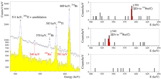 The one-dimensional energy spectra measured with the MoO sample and the background in the (490–630) keV energy region are shown in Figure 1, left. Two peaks 540 keV and 591 keV (expected for Mo →Ru decay) were observed in the experimental data collected with the MoO sample, while these peaks are absent in the background spectrum. The MoO had mass of 1199 g and 99.5% enrichment in Mo; thus, it contained Mo nuclei. The number of events in the 539.5 keV peak was determined by fitting the experimental energy spectrum to the energy interval (480–560) keV by the sum of the exponential distribution (which represents the background) and two Gaussians at 510.8 and 539.5 keV, respectively. This resulted in a value of for the number of events, with a fit of /n.d.f. = 0.76. In a similar manner, the number of events in the 590.8 keV peak was obtained by fitting the spectrum to the (560–625) keV energy region with the sum of the exponential with four Gaussians at 569.7, 583.2, 590.8, and 609.3 keV (/n.d.f. = 1.4):. Thus, the peaks are observed with more than a significance level. The results of the fit are shown in Figure 1, left. Taking into account the detection efficiencies for the 539.5 keV and for the 590.8 keV lines (calculated by EGS4 [] and GEANT4 [] simulations), one obtains year for the 539.5 keV peak and year for the 590.8 keV peak. Combining these results, we obtain the half-life: (stat.)(syst.) year, where the systematic uncertainties are related to the uncertainty of the mass of the MoO sample (0.01%), the enrichment in Mo (0.3%), and the calculation of the measurements’ live time (0.5%), with a major contribution from the calculation of the efficiencies [].