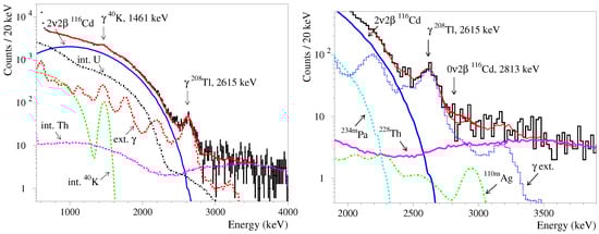 The energy spectrum of events from the data, collected over 26831 h with the CdWO detectors, is shown in Figure 2, left. It was fitted in the – keV energy region by the model built from the decay of Cd; the internal contamination by K, Th, and U; and the contribution from external s. The model functions were simulated by the Monte Carlo code with the EGS4 package [], and the initial kinematics of the particles emitted in the decays were given by the DECAY0 event generator []. The fit results in year for the half-life of Cd relative to the decay to the ground state of Sn; this result gives the highest accuracy to date for the half-life measurement of the decay of Cd (with a signal-to-background ratio of ≃2.6 in the – MeV energy interval).