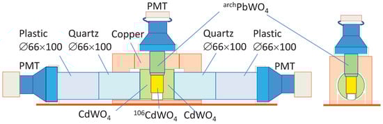 The presently running experiment is being realized to increase the detection efficiencies of the coincidence events; thus, the CdWO was installed in coincidence with two large-volume low-background CdWO crystal scintillators in close geometry. A scheme of the setup is given in Figure 3.