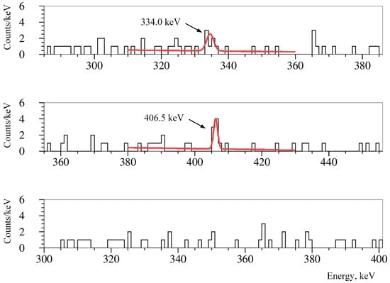 The radioactive contamination of the NdO sample before and after the applied purification process was measured as reported in []. In particular, the NdO sample was contaminated by La and Lu. The two-dimensional energy spectrum of coincidences between two detectors (events with multiplicity 2), accumulated over 16375 h with the NdO sample, was analyzed. The 2 decay of Nd to the first 0 excited level of Sm is followed by the emission of s in cascade with energies of 334.0 keV and 406.5 keV, respectively. By fixing the energy of the events in one of the detectors to the energy of the expected to be emitted in a cascade after the 2 decay of Nd to the first 0 excited level of Sm, a signal with energy corresponding to the other s in cascade is expected. Fixing the energy of one of the detectors to the expected energy with the energy window ±1.4 × FWHM, the coincidence signals at the supplemental energy (406.5 or 334.0 keV, respectively) were observed (see Figure 4).