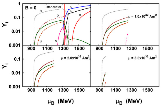 Particle population as a function of the baryon chemical potential calculated using the CMF model shown for different dipole magnetic moments . All figures represent equilibrium sequences obtained from the numerical solution of he Einstein-Maxwell equations at fixed baryon mass. For the non-magnetized case, the vertical red curve represents the chemical potential reached at the center of the star, namely, 1320 MeV.