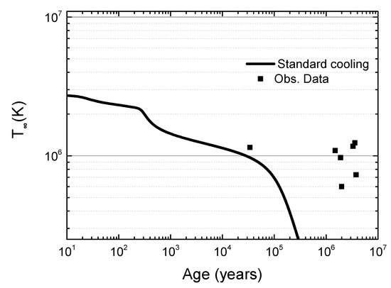 For the cooling calculation of Figure 3 we used a neutron star whose microscopic composition and equation of state (EoS) is given by the APR model [72]. The neutron star mass for this particular calculation is . Furthermore neutron and proton pairing are assumed to take place in the star such that agreement with Cassiopeia A is possible [65,66,67]. Figure 3 shows that the XDINS seem to be much warmer than what is predicted for their ages. This would indicate that, either there is a powerful heating mechanism (unbeknownst to us) that is keeping these objects warm at old ages, or, these objects are much younger than their apparent age. There is, of course, the possibility of both.
