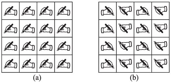 Let us consider a number of marked tiles, as so-called asymmetric units, containing the same figure (or its mirror image). For example, we draw a hand (right hand or left hand) taking a pen into the square-form tiles. Then we tile the plane with them periodically creating a so called fundamental tiling. This means that an arbitrary tile is a fundamental domain of the symmetry group of the tiling. In other words, the images of the chosen tile under the transformations of the symmetry group fill the plane without gaps and overlaps, creating the tiling. Our aim is typically to find all the essentially different fundamental tilings with our marked tiles. The symmetry group of such a tiling acts simply transitively on the tiles (namely, there is exactly one transformation mapping a tile onto another one) forming a subgroup of the complete symmetry group of the (non-marked) square tiling.