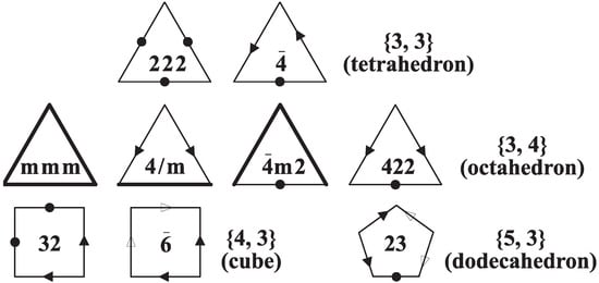 Our method enables us to examine the regular fundamental tilings of the spherical or hyperbolic plane too. The 5 regular tilings of the spherical plane , , , , can be derived from the Platonic solids mapping them to a concentric sphere from the common centre. Looking for the non-equivariant edge identifications of the triangle, the square and the pentagon and applying the Poincaré algorithm we can find the discrete transformation groups that act simply transitively on these tilings. Of course, each of them is a subgroup of the symmetry group of the corresponding Platonic solid. In Figure 6 we can see the appropriate edge identifications and the generated groups with their crystallographic (point group) name.
