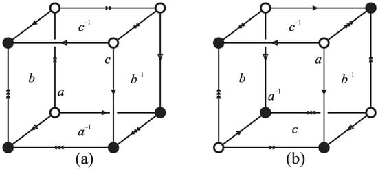 Two flags and are said to be vertex-adjacent if but and . Similarly, we can also define the edge- and face-adjacency of two flags. We assume that the flag structure of P is strictly connected. This means that each flag has exactly one face-, edge-, and vertex-adjacent flag in , furthermore, if and are two different flags in than there is a finite sequence of flags from to so that each flag in the sequence has the common components of and moreover and are face-, edge- or vertex-adjacent flags (). Of course, if P is a regular polyhedron, then this assumption holds automatically.