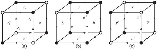 In Section 2 we have also seen how the Poincaré algorithm forms the defining relations (more precisely the cycle transformations) to a given system of edge identifying generators. Now the generators are given by a face identification (). We choose an edge and a flag joining it. Then we consider the face component of and write the name of the corresponding transformation belonging to (the restriction of onto the flags of ). The next flag will be the face-adjacent flag of . Then we write the name of the second transformation belonging to , thus we obtain the composition . We continue this method until in the step we get back the starting flag as the face-adjacent flag of . Then we obtain the cycle transformation which could be a defining relation with an appropriate exponent k: . Starting with an edge not appeared among , , ⋯, , we can find another cycle transformation, and so on until each edge occurs in a cycle.