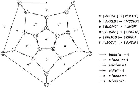 that means . We can also see that in this procedure each vertex of P has been mapped onto A, so the Poincaré algorithm gives only one relation now. Moreover, we have to take into consideration that the procedure does not produce the relations to the involutive (involutory) generators, so these ones must be added to the previous relation(s). Thus, we get the symmetry group by generators and defining relations:
