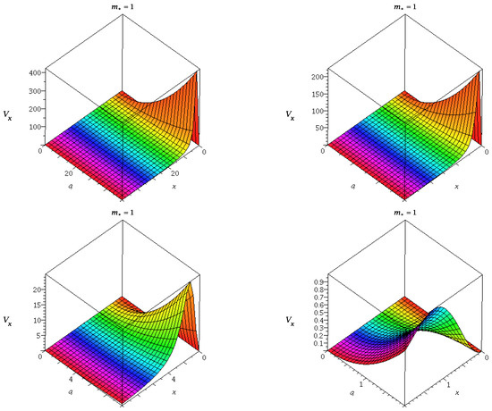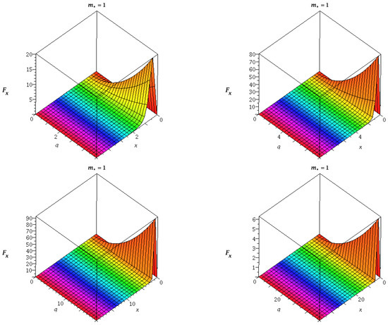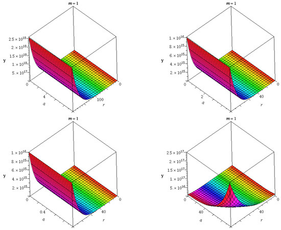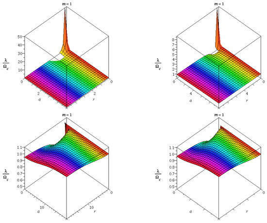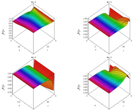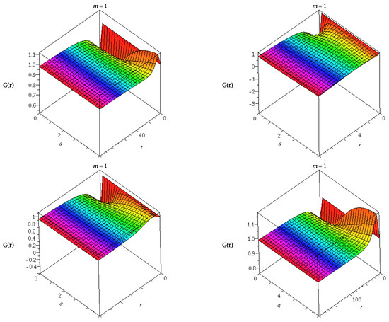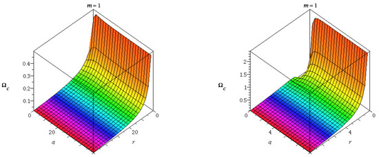 In the limit , one obtains the QNM frequency for Schwarzschild BH in the eikonal limit [33]. Similarly, it implies that the real and imaginary parts of the QNMs of regular ABG BH in the Eikonal limit are given by the frequency and instability time scale of the unstable circular photon geodesics. One could observe the variation of angular frequency and with and q in Figure 11, Figure 12 and Figure 13. It should be noted that in the eikonal limit the relation between the null circular geodesics and QNMs frequency get violated in case of higher curvature gravity i.e., Lovelock gravity [34] but for regular BHs this relation does not violate at all as we have seen from our computation.