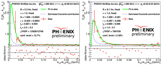 The data used in the analyses were collected by the PHENIX detector in 2010; 7.3 billion minimum bias Au+Au collisions at GeV were recorded. We measured three-particle correlation functions of and triplets in 31 bins ranging from 228 to 871 MeV, with event selection, single track cuts and pair cuts identical to the analysis of [8]. The visualization of three-dimensional fits is difficult; thus instead of showing two-dimensional projections of these three-dimensional fits, we have decided to show, as an illustration, various one-plus-one dimensional slices of them. These slices were obtained by requiring that the two-particle relative momenta between the pairs , and were equal. The values and the confidence levels were statistically acceptable. Figure 1 indicates the PHENIX preliminary three-particle correlation data and the fitted curve as a univariate slice of a multi-variate function. We note that no significant long-range correlation was observed: was close to zero. In these fits, the values of the Lévy scale R and the Lévy index of stability were taken from PHENIX preliminary two-particle correlation data in the same transverse-momentum bins and in the same selection of minimum-bias GeV Au+Au collisions. (See these preliminary R and data in [21].) Within one standard deviation, the same parameter values were obtained if we released the values of R and in these fits, indicating an internal consistency between the two- and three-particle correlation measurements. Given this internal consistency and our focus on the comparison of the strength or intercept parameters and of the two- and three-particle BEC functions, here we report these values using the R and values as determined from the two-particle BEC function measurements in minimum-bias GeV Au+Au collisions [21].