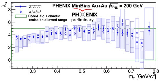 The three-particle correlation strength, derived from and fit parameters as , can be seen in Figure 2. According to the core-halo model, had to be in the range , as indicated by a green box in Figure 2. One can see that within errors, this parameter fell in the allowed range. The detailed description of the systematic uncertainty sources is given in [].