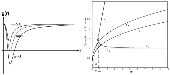 In the asymptotically flat case (), the metric is asymptotically de Sitter for and asymptotically Schwarzschild for large r. It has two horizons ( in Figure 1 (right)) which coincide for a certain mass corresponding to an extremal black hole [20,34]. Typical behavior of the metric function is shown in Figure 1 (left). The parameter m refers to the mass M normalized to . The compact objects without horizons (), replacing naked singularities, correspond to the gravitational solitons G-lumps [20,34] defined in the spirit of Coleman lumps [60] as non-singular non-dissipative objects keeping themselves together by their own self-interaction.