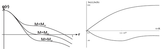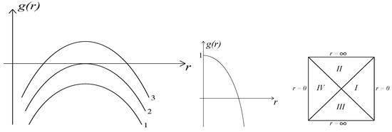 Two double-horizon states and , correspond to the values and , respectively. In Figure 4 (right) [40] we show dependence of the double horizon (line denoted by ) and of the double horizon (line ) dependently on the parameter q. For the certain values of and , three horizons coincide at the triple horizon (Figure 4 (right), the point where two lines meet). The values of , and are uniquely defined by three algebraic equations defining the triple horizon, , and [27,40].