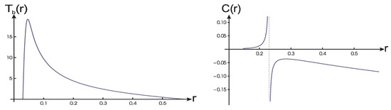 Behavior of temperature of the event horizon ( here), shown in Figure 5 (left), plotted with the value of [39], is generic for black holes with the de Sitter center and dictated by the behavior of the metric function [39]: ; as , and as . In the maximum of the specific heat capacity (shown in Figure 5 (right), plotted with [39]) is broken and changes sign, hence a second order phase transition occurs which is followed by the quantum cooling [34,39,45]. At the phase transition the temperature acquires its maximal value [39]
