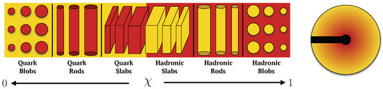 the hadronic phase becomes the rare phase with its geometry evolving in reverse order (from slabs to rods to blobs).