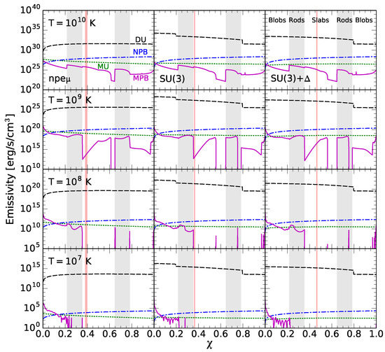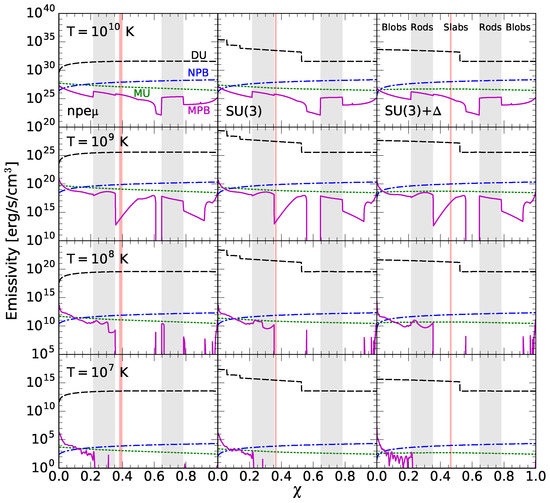 7], and this allows for a comparison between emissivity contributions from standard and enhanced neutrino emission mechanisms including the direct Urca (DU), modified Urca (MU), and baryon–baryon and quark–quark Bremsstrahlung (NPB) processes, and contributions from electron–lattice interactions. For a detailed summary including the equations and coefficients used for the calculation of the standard and enhanced neutrino emission mechanisms, see [