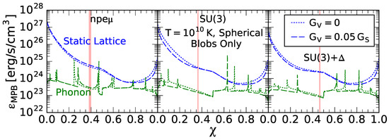 Figure 8 shows that the static-lattice contribution to the MPB emissivity dominates the phonon contribution rendering it negligible, particularly at quark fractions relevant to the neutron stars of this work (