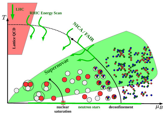 Schematic phase diagram of strongly interacting matter with the solid lines indicating first order liquid-gas and hadronic-quark matter phase transitions ending in dots symbolizing the critical endpoints. While for the nuclear liquid-gas phase transition the critical point is at a temperature of MeV [1], the position of the critical endpoint of the deconfinement transition is not known. The dashed line indicates the pseudocritical temperature of the crossover transition from hadronic to quark matter which has been determined at vanishing baryochemical potential in lattice QCD simulations to MeV [2]. The red and white colored circles stand for neutrons and protons which at low densities can form nuclear clusters that get dissociated in the liquid phase. Similar to that case, nucleons themselves can be viewed as clusters of quarks symbolized by colored dots that get dissociated in the quark matter phase. The green shaded area is the domain of the phase diagram accessible by supernova explosions. The red shaded area is the region accessible by ab-initio simulations of QCD at finite temperatures and chemical potentials on space-time lattices. The green arrowed lines symbolize trajectories of heavy-ion collisions at different center of mass energies ranging form LHC over RHIC to the planned NICA/FAIR experiments. The green line on the chemical potential axis depicts the range of values accessible in compact star interiors. In this case, the third dimension of the charge (or isospin) chemical potential relevant for isospin asymmetric systems in supernovae, compact stars and their mergers is suppressed.