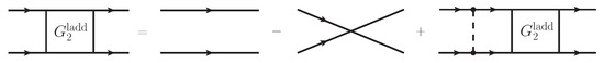 The latter approach (using Equation (4)) has been extensively used in many-particle systems [8,9,10,11,12], in particular in connection with the chemical picture. The main idea of the chemical picture is to treat bound states on the same footing as “elementary” single particles. This way one describes correctly the low-temperature, low-density region of many-body systems where bound states dominate. Within a quantum statistical approach, the chemical picture is realized considering the A-particle propagator. In ladder approximation, see Figure 2, the Bethe-Salpeter equation (BSE)
