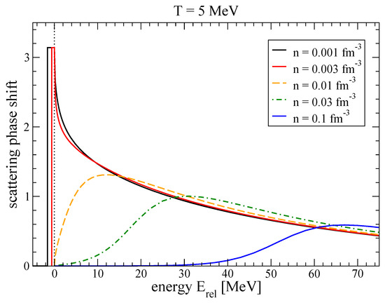 As an example let us consider the case . A consistent description of the medium effects should contain not only the mean-field shift of the quasiparticle energies but also the Pauli blocking, as shown in this work for conserving approximations. Within the generalized Beth-Uhlenbeck approach [12], Pauli blocking modifies the binding energy of the bound state (deuteron) in the isospin-singlet channel as well as the scattering phase shifts. The integrand of the intrinsic partition function is shown in Figure 3.