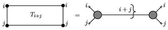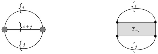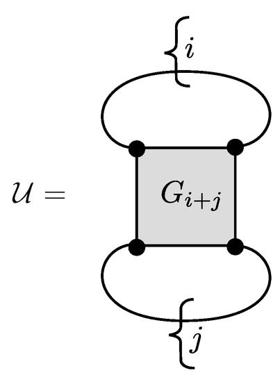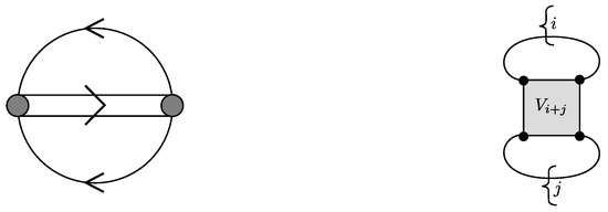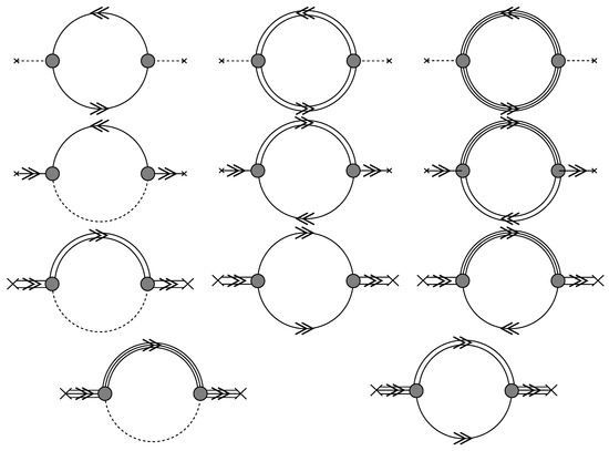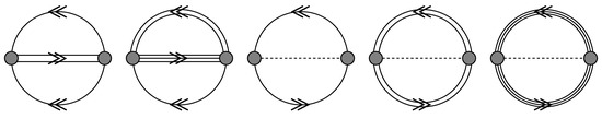 which is straightforwardly proven by multiplying Equation (26) with and using Equation (30). Since these two equivalent expressions in Equation (31) are at the same time equivalent to the two-cluster irreducible functional introduced above in Equations (20) and Figure 5, the functional relations