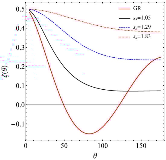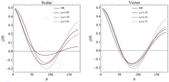 It is clear that these curves are very similar to each other, so it would be difficult to distinguish different polarizations. If one chooses the values for the s given in Table 1, the for the scalar GW is modified, as shown in Figure 2. Since if , there are no vector polarizations, the corresponding was not plotted. Figure 2 shows that for the scalar GW is very different from the one for the tensor GW. So, it is easier to distinguish the scalar polarizations from the tensor ones.