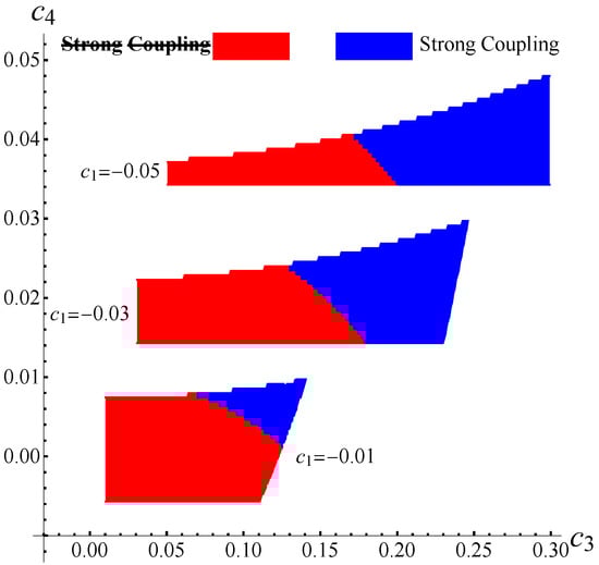 Generalized TeVeS theory is the generalization of the theory originally proposed by Bekenstein to attack the dark matter problem []. Compared with Einstein-æther theory, it has an additional scalar field, , which also mediates gravity. Matter fields minimally couple to the physical metric . One can easily verify that there are six d.o.f.: , , , and . They propagate at four different speeds named and , respectively. In addition, there are the plus, cross, vector-x, and vector-y polarizations. The two scalar d.o.f. excite two copies of mixed states of the transverse breathing and the longitudinal polarizations. There are also several previous experimental constraints on this theory, as given in Refs. [,,,,]. Combining all of these constraints shows that the speed () for is generally much larger than 1, which might lead to the faster decay of binary systems, so this theory might be excluded. However, a very large speed might result in strong coupling. We examined whether strong coupling for takes place. Figure 3 displays the parameter subspaces that are compatible with the experimental constraints. Strong coupling does not exist in the red regions, while in the blue areas, strong coupling takes place. Then, the generalized TeVeS theory is excluded in the parameter space where strong coupling does not exist. Further analysis is required to determine whether it survives in the blue regions.