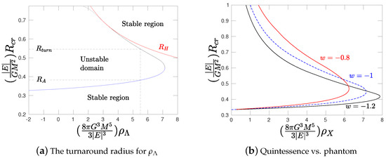 However, at even bigger scales, dark energy restores the stability of the equilibrium states [8,9,10], as depicted in Figure 1a. Therefore, a spherical non-homogeneous perturbation will decouple from the expansion and collapse only below a threshold radius, the turnaround radius (an incomplete list on the subject includes [11,12,13,14,15,16]). This radius estimated by equilibria of an isothermal sphere as we did in [8,10] is smaller and thus stricter—rendering our estimation more accurate—than the one estimated considering only homogeneous equilibria (e.g., published later [14]).