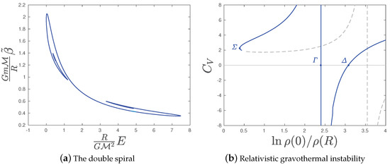 The caloric curve, i.e., the temperature vs. energy diagram, attains the form of a double spiral, as designated in Figure 2a and discovered for the first time in [7]. The upper spiral corresponds to the low-energy gravothermal instability and the lower spiral to the high-energy gravothermal instability. The intensity of relativistic effects is controlled by the rest mass compactness: