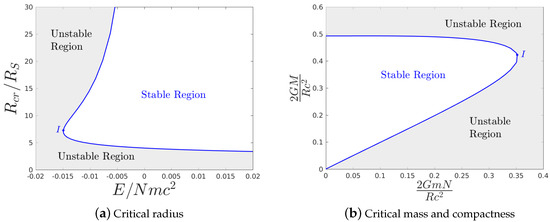 is negative, but sufficiently high so that stable equilibria do exist, there appear two critical radii, which delimit the stable domain shown in Figure 3a. The maximum radius corresponds to the (Antonov-type) low-energy gravothermal instability, and the minimum radius signifies the relativistic gravothermal instability. The two critical radii merge at the ultra minimum gravothermal energy , below which no equilibria exist. For positive gravothermal energy E, there appears only the relativistic gravothermal instability.