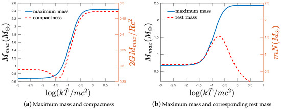 The maximum mass limit of ideal neutron cores w.r.t. temperature. On the left (a) is plotted also the corresponding compactness (red dashed line), whose scale is depicted on the right y-axis. In the right panel (b) is shown, together with maximum mass, the corresponding rest mass (red dashed line) at the same scale.