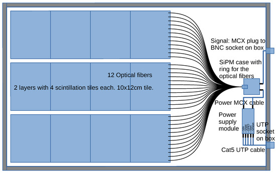 The design schematic on which the construction was based. The scintillation tiles are shown on the left in blue and the optical fibers as black lines. The components on the right are the SiPM with its enclosing case, the fibers’ termination, the power supply module, and the cabling.