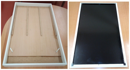 On the left photo the PVC box with the MDF support structure inside is shown. The long thin slats shown are glued on the MDF wood and the scintillation tiles are fitted in between. On the right the lid is shown with the black adhesive sheet on the inside for light proofing.