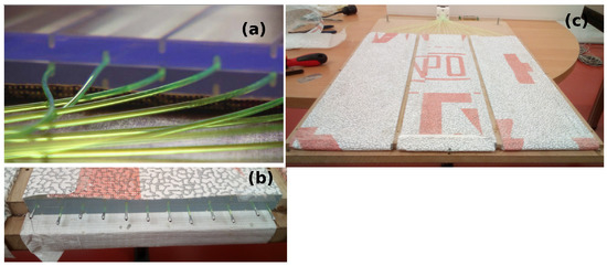 The scintillation tiles are made from molded scintillation material (SC-301). Each tile is 10 × 12 × 0.5 cm with grooves for the WLS fibers (see Figure 3a). The scintillation material emits 8250 optical photons per MeV of deposited energy (55% the light output of anthracene), the main decay time is 2.4 ns, while the maximum emission is at 430 nm optical photon wavelength. The scintillation tiles are placed on the wooden support frame described in Section 2, the WLS fibers are inserted in the grooves, and the overall is enclosed in a reflective Tyvek paper to enhance light output (see Figure 3c). The WLS optical fibers are Bicron BCF-91A with an absorption length of 3.5 m, they are interfaced with the SiPM using a 3D printed construct described below, while at the opposite side they are clean cut and painted with reflective paint (see Figure 3b).