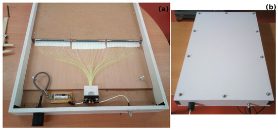 (a): The finished detector unit before closing the lid. At the bottom middle the SiPM and WLS fibers support structure are shown. At the bottom left the power supply module is shown. The UTP (left) and BNC (right) connectors are also shown. (b): The finished detector unit after closing the lid. The lid is firmly attached to the box with ten through hole screws.