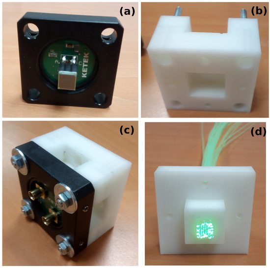 (a): The KETEK PM6650-EB SiPM attached to a small PCB board on a metal frame. (b): The bottom part of the 3D printed construct. This part is screwed on the PCB metal frame with the shown direction. (c): The back of the SiPM metal frame which is has been fitted on the bottom part of the 3D printed construct. (d): The top part of the 3D printed construct that holds the WLS fibers. The top part is screwed on the bottom one.
