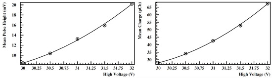The mean of the pulse height (left) and charge (right) distributions as a function of the SiPM power supply voltage. The mean is estimated as the mean of the Landau probability distribution function (PDF), which better fits the experimental distribution acquired. The Landau PDF describes the energy loss of relativistic charged particles by ionization of the medium (scintillator material).
