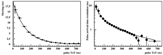 - Estimate the appropriate parameterizations of the pulse arrival timing correction versus the pulse size. For the Cosmics we choose to have full digitization of the pulse of the SiPM using a low-cost USB oscilloscope. The oscilloscope is the Hantek 6254BD with four channels, 250 MHz bandwidth and a sampling rate of 1 GHz. The pulse arrival time is defined as the time when the pulse’s leading edge crosses the threshold of 6 mV (equivalent to 0.3 MIPs, since the MIP have a mean pulse height of 20 mV). However, this definition inserts a systematic error on the timing, since the pulse arrival timing does not depend only on the incident time of the EAS particle on the detector unit, but also on the pulse size (larger pulses have steeper leading edges). This effect (slewing) is corrected using parameterizations of the systematic timing shift versus the pulse size for each detector unit. The parameterizations are evaluated during the calibration by using the hodoscope setup referenced at step 1. To estimate the systematic timing shift of the middle detector unit we take the arrival time difference between this unit’s pulses and one of the hodoscope unit’s pulses (reference pulses) (Only when the reference pulses are large. The slewing timing shift decreases as the pulse size increases, so by comparing relative to the timing of a large reference pulse the result can be considered unaffected by the slewing effect of the reference pulse.). The procedure is repeated for every pulse size region of the middle detector unit, and an example result for a detector unit is shown in left plot of Figure 7. In this plot the systematic timing shift is expressed as a function of the Time over Threshold (ToT) value of the pulse (this is the time interval where the pulse exceeds the threshold of 6 mV) (When the whole pulse is digitized there is the option to apply more sophisticated pulse arrival time estimations, e.g., fit the pulse with a standard shape or apply a constant fraction discriminator software algorithm on the digitized pulse, or use the inflection point of the rising edge of the pulse. All these methods are equivalent if the pulses follow a standard shape and only the pulse maximum (height) changes. Moreover, these methods define the pulse arrival time in a way independent of the pulse height. However, it was found that either the performance of these methods is limited due to the vertical resolution and dynamic range of the oscilloscope used, or they are too much CPU intensive and do not significantly improve the timing accuracy compared to the method referenced in the text.). In this step the synchronization of the detector units is also performed. The synchronization consists of estimating the relative time delays of the unit’s pulses due to possible differences in signal cables.