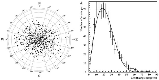 The results of the reconstruction are shown in Figure 8. The left plot is a plane projection of the reconstructed directions, while on the right plot the zenith angle distribution is shown. This distribution is fitted with a function of the form , where . The found index from the fit is consistent with the one found when acquiring EAS with the HELYCON air shower array or similar detectors [7,8].