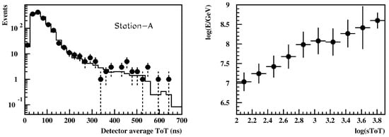 The fact that the ToT value is a measure of the collected charge in each HDM5, and the very good agreement between the experimental ToT values with the simulation prediction allows us to draw safe conclusions using the ToT information from the simulation. For example in Figure 2 (left) is shown the distribution of the average ToT value of the HDMs of station-A (points) in comparison with the simulation, while the discrimination power of the sToT quantity is demonstrated in Figure 2 (right) where the primary energy of the EAS is plotted against the value.