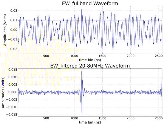For each reconstructed shower the RF signals are filtered in order to keep frequencies in the range 20–80 MHz, since for frequencies below 20 MHz the ionosphere is strongly reflective, and human-made signals from long distances can still contribute to the noise, while at high frequencies, over 80 MHz, strong signals from the radio FM band are present. The filtering procedure is implemented in two phases. Initially, the waveform is subject to Tukey filtering, suppressing the outliers, and then, a Fast Fourier Transform (FFT) is applied. After this transformation, the non-desirable frequencies are removed and subsequently the inverse Fourier Transform (FFT) is applied, providing the filtered signal for further analysis. Furthermore, for the analysis of the antenna recorded events, the EW component was used since the EW direction is more sensitive. This is due to the effect of the Lorentz force on the charged particles of the EAS, as the vector of the magnetic field points to the South, reinforcing the possibility of detection in the perpendicular direction EW. In Figure 3 is shown the EW waveform before and after filtering (20–80 MHz) for a cosmic event.