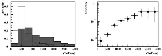 (Left) the distribution of the sToT value for shower data with identified RF signals (filled histogram) and for shower data without RF signals (unfilled histogram). (Right) the measured efficiency of detecting RF signals as a function of the sToT value in double station coincidence data.