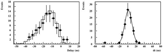 (Left) The expected (histogram) and the measured (points) distribution of the RF signal delay with respect to the latest HDM time. (Right) the distribution (points) of the deviation of the measured and the expected RF signal timing. The line represents the gaussian function (, that fits the distribution.
