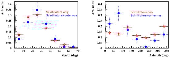 The zenith (left) and the azimuth (right) distribution of reconstructed showers with sToT value grater that 500 ns. The red stars represent the data distributions of reconstructed showers using only the scintillator information, while the blue points represent the data distributions of reconstructed showers with identified RF signals.