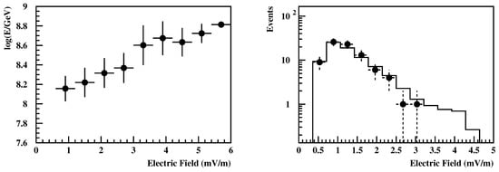 (Left) the energy of the primary as a function of the induced electric field at the antenna positions as derived from the simulation for double station coinicedence events. (Right) the electric field distribution of the data sample (points) in comparison with the simulation (histogram).