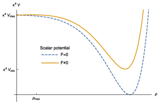 This plot shows the scalar potentials in the and cases. When , we have a local maximum at and a global minimum with zero cosmological constant. For , the local maximum is shifted by a small positive value to . The global minimum now has a positive cosmological constant.