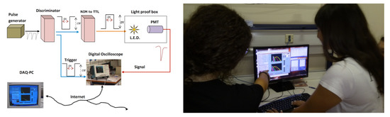 Figure 4 (left). A pulse generator is used to drive an LED that illuminates the PMT, both installed inside a lightproof box. The PMT waveforms are acquired by a digital oscilloscope that is triggered by the pulser. The digital oscilloscope is managed through specific software developed for this experiment, hiding the details of the electronic units from students who only change the light intensity of the source and the high voltage of the PMT. The software acquires pulses and evaluates the charge (pulse integration) and peak voltage of each pulse, producing the relevant histograms that appear on the screen (