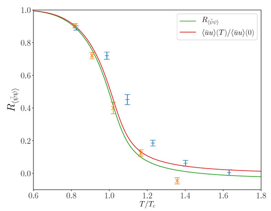The relative-temperature dependence of the subtracted (and normalized) condensate defined by Equation (17) and introduced by Ref. [81]. The lattice data points are from Figure 6 of Ref. [82], but scaled for the critical temperatures from their Table 2, which is different for the “crosses” (data points [82] for MeV) and “bars” (data points [82] for MeV). The lower, green curve results from the (17) subtraction of our u-quark condensate. The upper, red curve is the T-dependence of our u-quark condensate when regularized in the usual way (see text).